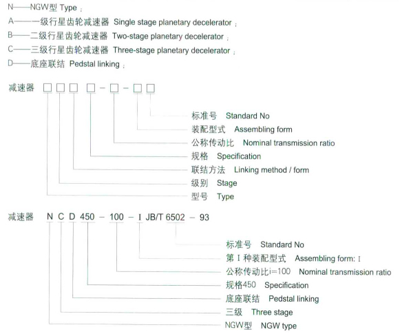 其標(biāo)記符號(hào):Symbol include:type,stage no,linking,form,nominal transmission ratio,assembling form,standard no。