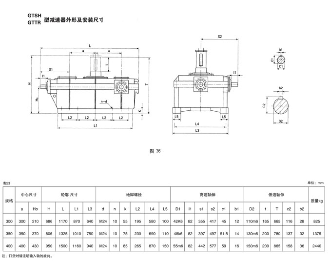 GTTR三環(huán)減速機為組合二級傳動,為鋼包回轉(zhuǎn)臺用,具有兩根垂直于平面的高速軸,箱體平置,裝端面剖分,此減速機中心距范圍300-400mm,速比77.9-503.3,輸出轉(zhuǎn)矩范圍10.52-24.67kN.m。